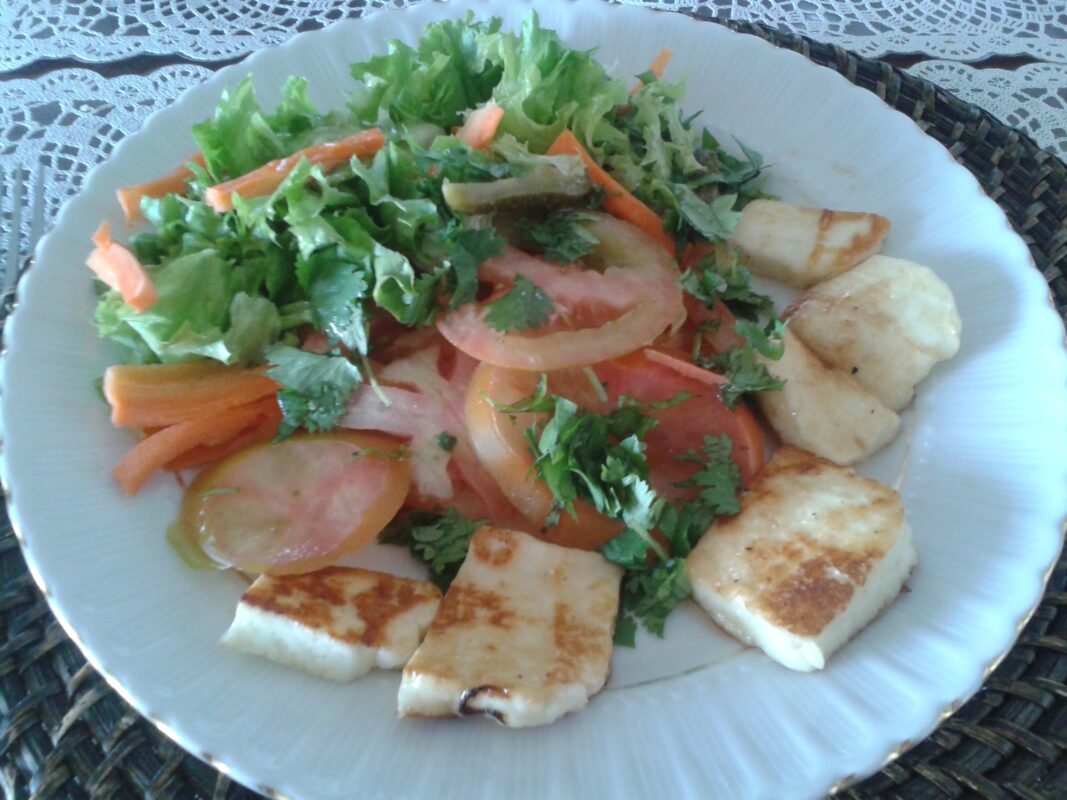 Hellimli salata is a traditional Cypriot salad made with grilled halloumi cheese, fresh vegetables, olives, herbs, and a simple dressing of olive oil and lemon juice.