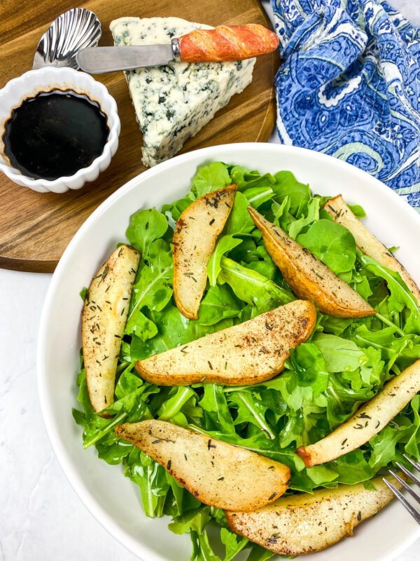 Roasted Pear and Blue Cheese Salad is a delicious dish that combines the sweetness of roasted pears with the tanginess of blue cheese, all served on a bed of fresh greens such as arugula or mixed greens. It's often drizzled with a balsamic vinaigrette dressing to enhance the flavors.