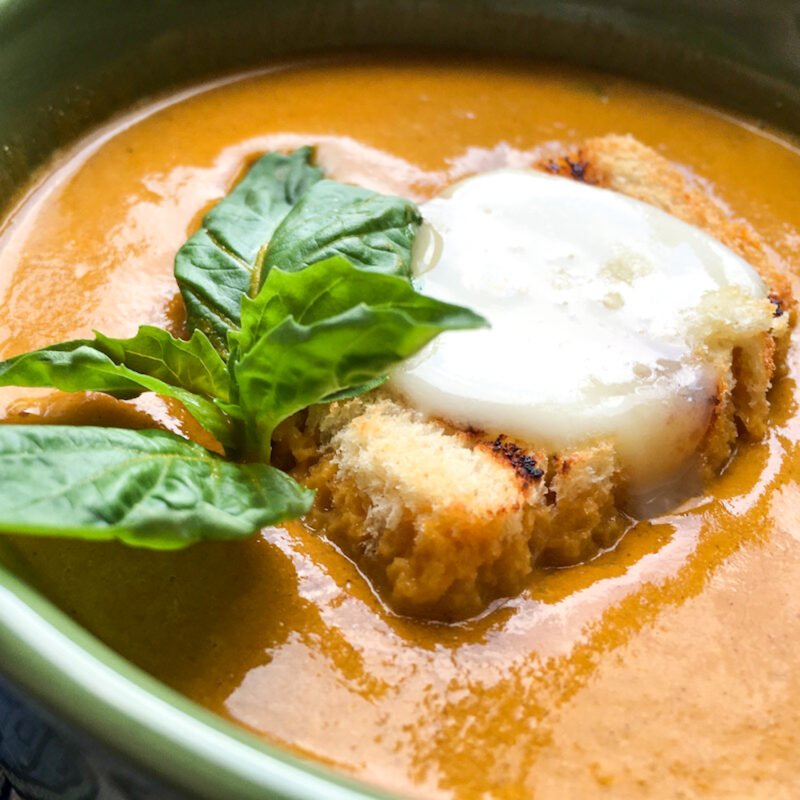 Roasted Yellow Tomato Soup with Grilled Cheese Croutons