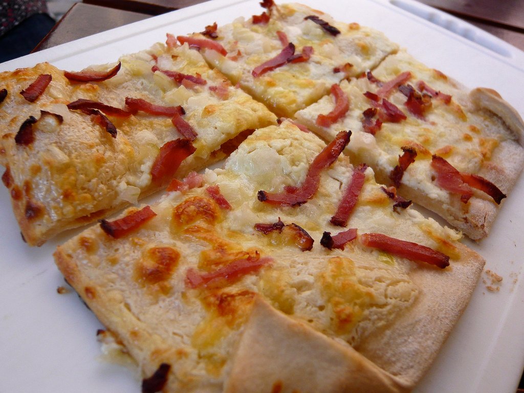 Flammkuchen, also known as tarte flambée, is a traditional dish from the Alsace region of France and neighboring areas in Germany. It is a thin, crispy pizza-like dish topped with crème fraîche, onions, and bacon, and sometimes other ingredients like cheese or mushrooms.