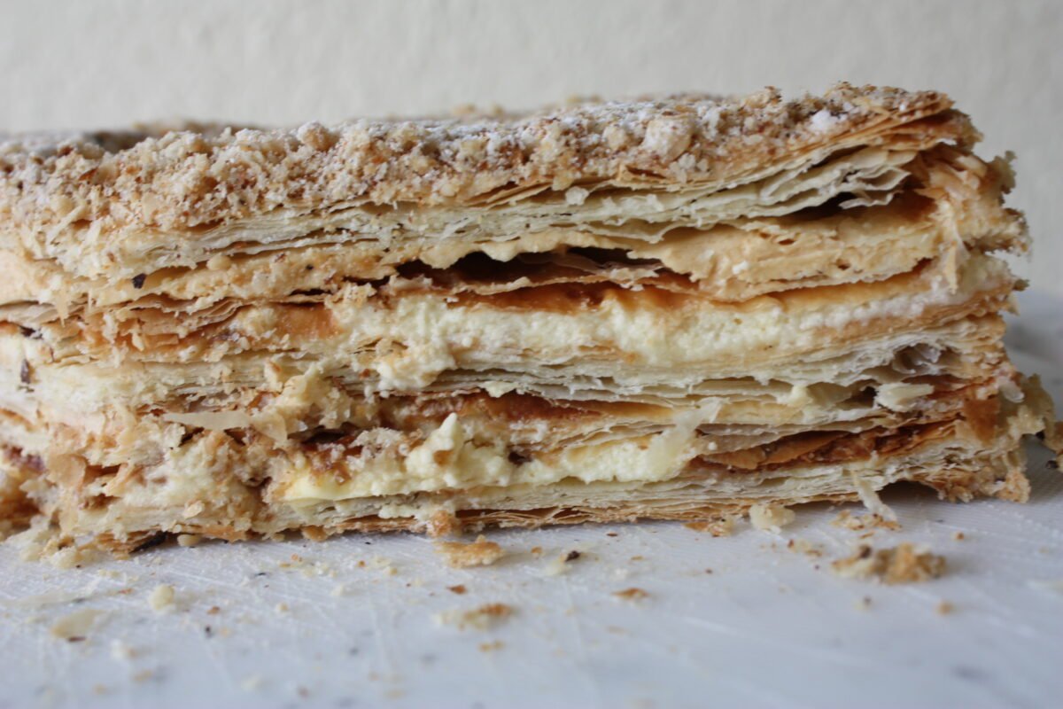 Mille-feuille is a delicious French pastry also known as a Napoleon. It consists of layers of puff pastry alternating with layers of pastry cream or whipped cream. The top is typically glazed with icing or dusted with powdered sugar.