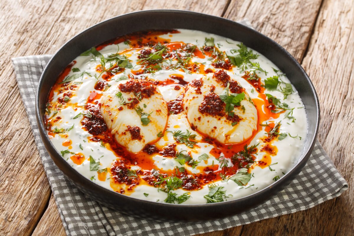 Turkish Style Eggs-Cilbir is a delicious and popular Turkish dish consisting of poached eggs served on a bed of garlic-infused yogurt and drizzled with a spicy chili-infused butter. It is often garnished with fresh herbs and served with warm bread for dipping.