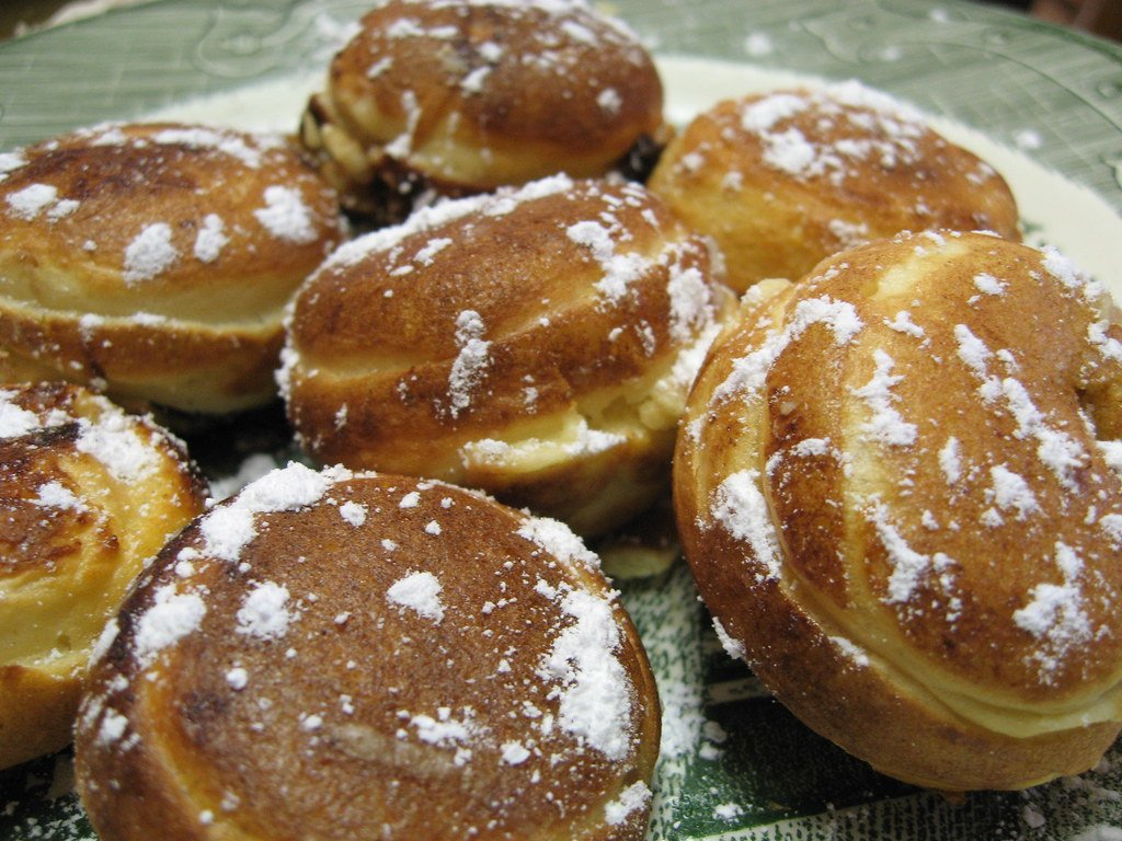 Aebelskivers are a traditional Danish dessert that are like small, round pancakes. They are typically served with fruit preserves, powdered sugar, or syrup.