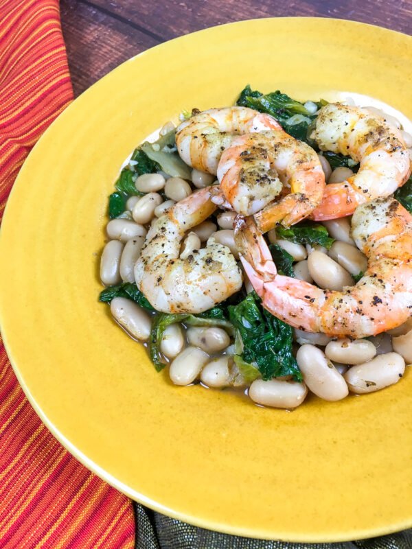 Shrimp Oreganato is a delicious dish made with cannellini beans, garlic, olive oil, herbs, and shrimp, served over escarole with a hint of lime juice and optional Parmesan cheese for added flavor.
