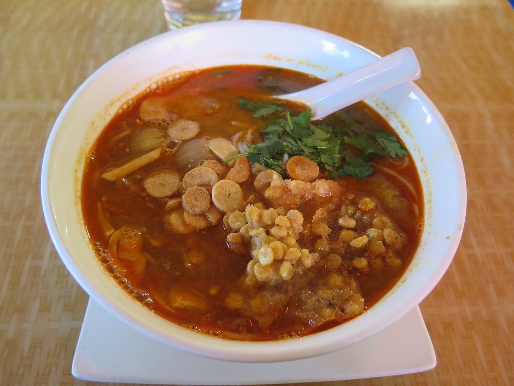 Mohinga is a traditional Myanmar (Burmese) dish. It is a soup dish made with thin rice noodles in a fish-based broth with lemongrass, ginger, onions, and various other herbs and spices.