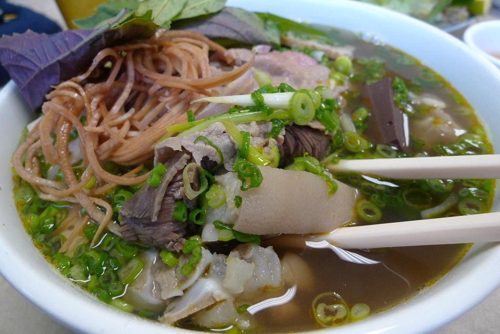 Bun Bo Hue Dac Biet is a traditional Vietnamese noodle soup dish that originated in the city of Hue. It is made with a spicy beef broth that is seasoned with lemongrass, shrimp paste, and chili oil. The soup is typically served with beef shank, pork knuckle, and sometimes pig's blood.