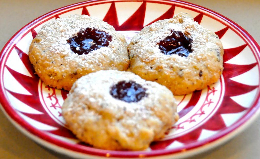 Raspberry-Hazelnut Thumbprint Cookies are a type of cookie that combines the flavors of raspberry and hazelnut. The cookies are made with a buttery dough that is rolled into balls, then pressed with a thumb to create an indentation in the center. The indentation is then filled with raspberry jam and chopped hazelnuts.