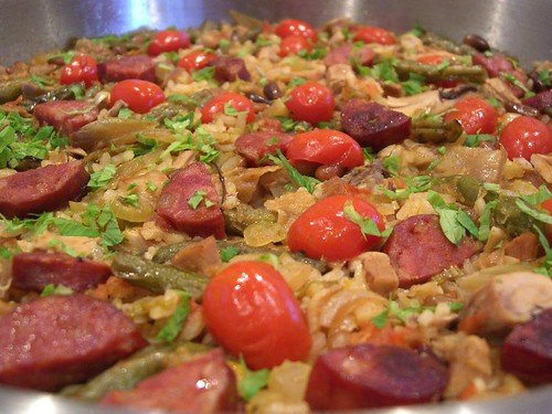 Paella with Chorizo and Roast Chicken is a delicious Spanish dish made with saffron-infused rice, chorizo sausage, roast chicken, and a variety of vegetables like bell peppers, peas, and onions. It’s a flavorful and hearty meal that combines savory meats with the subtle sweetness of saffron.