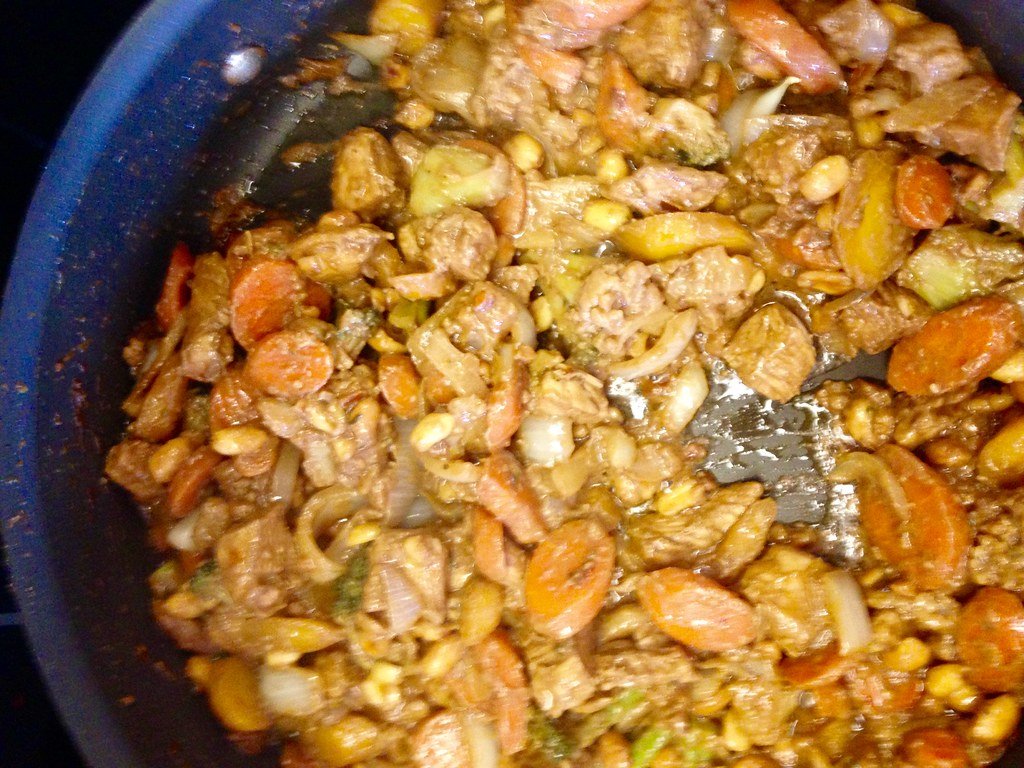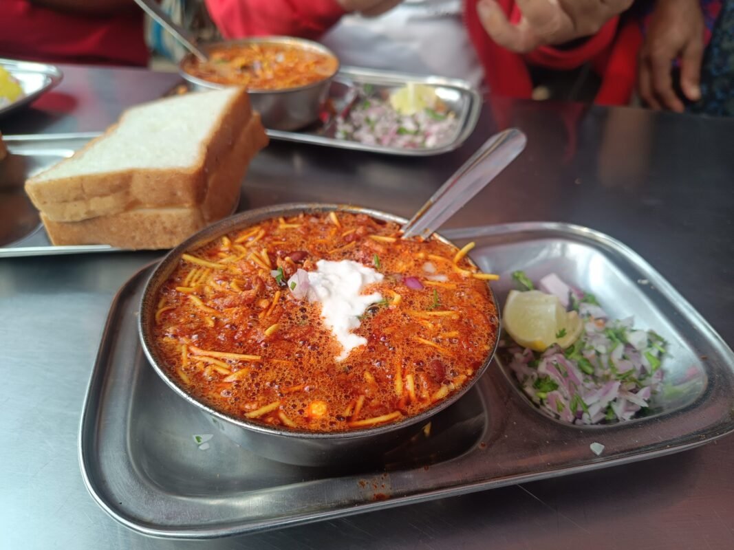 Spicy noodle soup with tofu and bean sprouts in orange broth