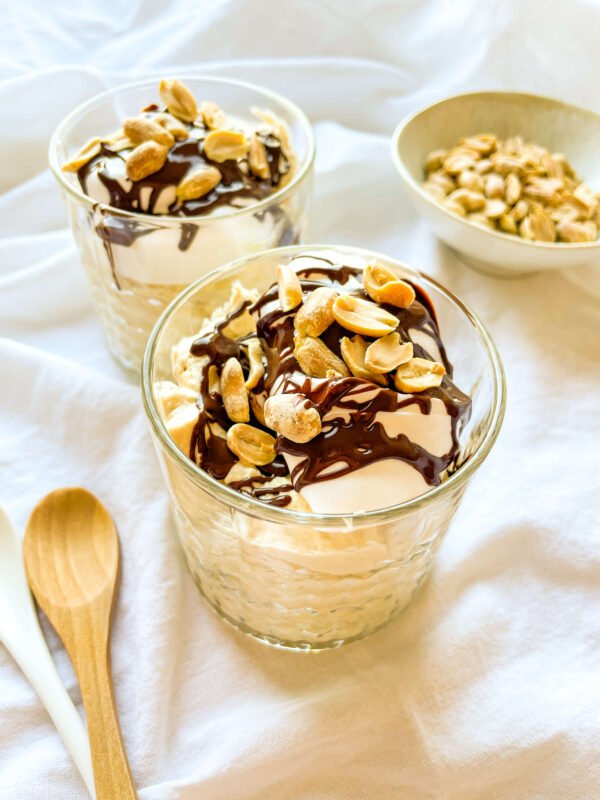 Chocolate Peanut Butter Mousse Parfaits are delightful and indulgent desserts consisting of layers of creamy chocolate mousse and smooth peanut butter mousse, topped with a drizzle of chocolate sauce and sprinkled with crushed peanuts. They are served in elegant glass parfait cups, making them not only delicious but also visually appealing.