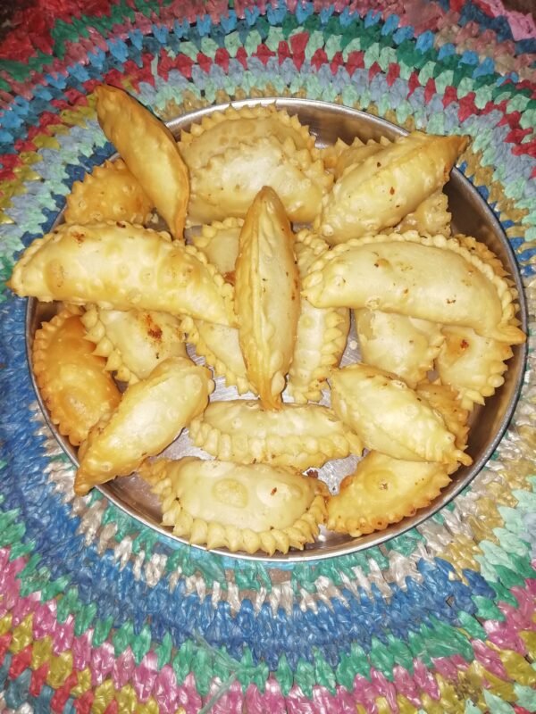 Gujiya is a popular Indian sweet pastry filled with a mixture of khoya (milk solids), nuts, and coconut. It’s deep-fried and then dipped in sugar syrup or dusted with powdered sugar.