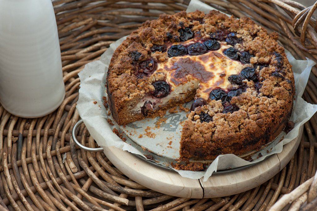 Cherry & Ricotta Crumble Cake is a delicious dessert made with cherries, ricotta cheese, and a crumble topping.