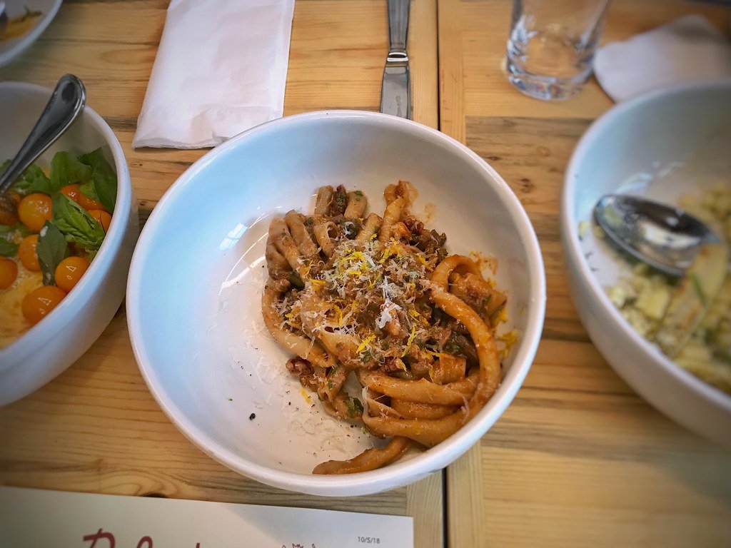 Spacatelli, chicken livers, red walnut, orange zest