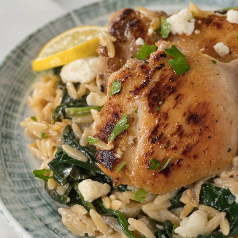 Lemony Spinach Orzo with Feta Topped Chicken