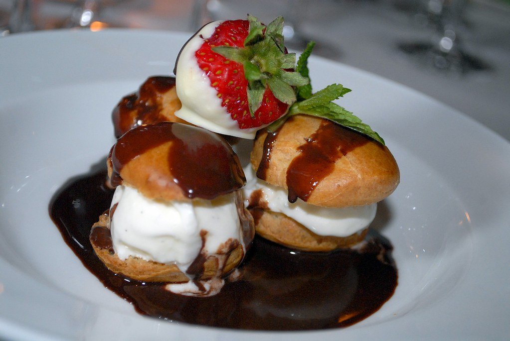 Profiteroles are a French pastry that consists of a small choux pastry ball filled with whipped cream, pastry cream, or ice cream and topped with a sweet glaze or powdered sugar.