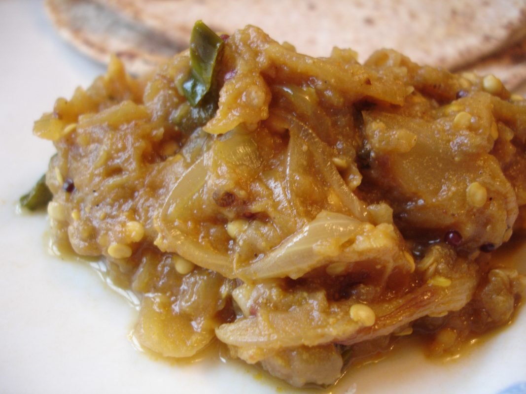 Baingan Bharta is a popular Indian dish made with roasted eggplant that is mashed and cooked with tomatoes, onions, and a blend of spices. It has a smoky flavor and is often served with roti or rice.