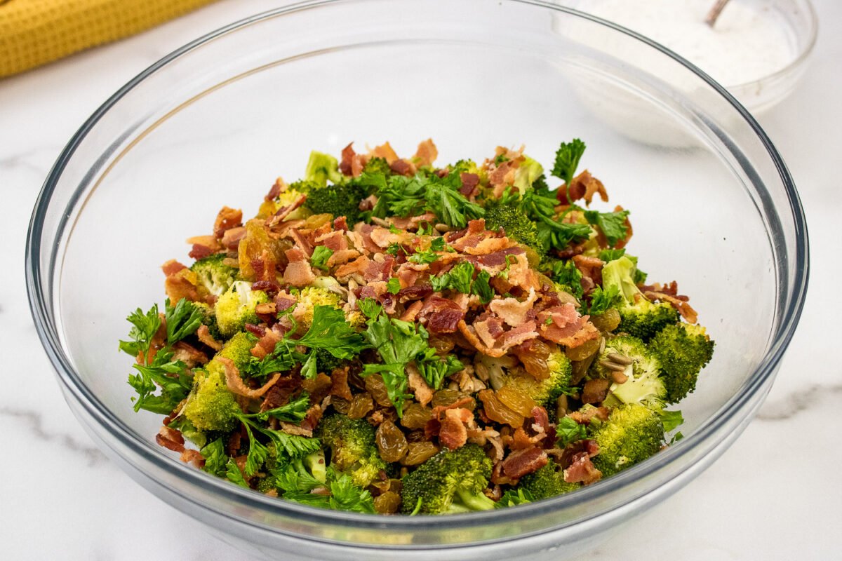 Broccoli salad is a delicious dish made with fresh broccoli florets, usually mixed with ingredients like red onions, bacon, sunflower seeds, and a creamy dressing.