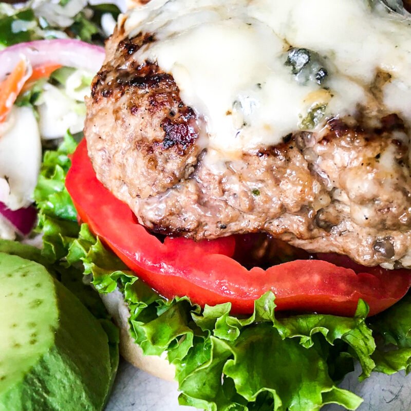 A combination of sweet Italian pork sausage, salt, black pepper, Worcestershire sauce, onion, garlic, and fresh rosemary are used to pack a lot of flavor into each bite. As an added bonus, the Worcestershire sauce and onion increase the juiciness of the burger without adding extra fat.