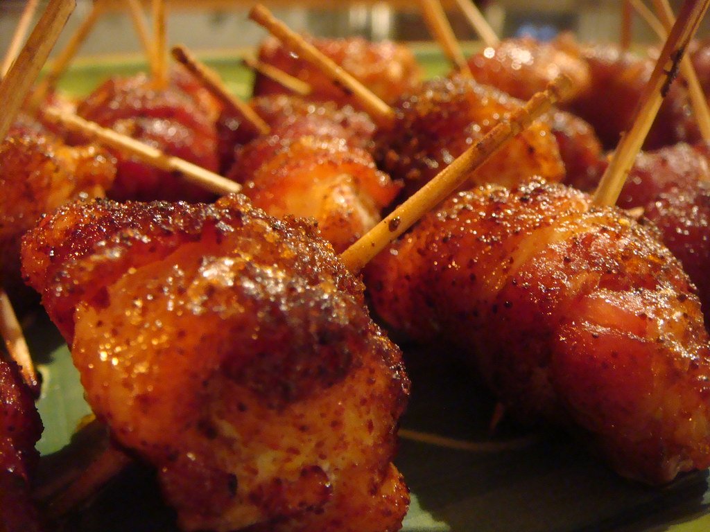 Bacon-wrapped chicken bites are delicious appetizers made by wrapping bite-sized pieces of chicken in bacon and then baking or grilling them until the bacon is crispy and the chicken is cooked through.