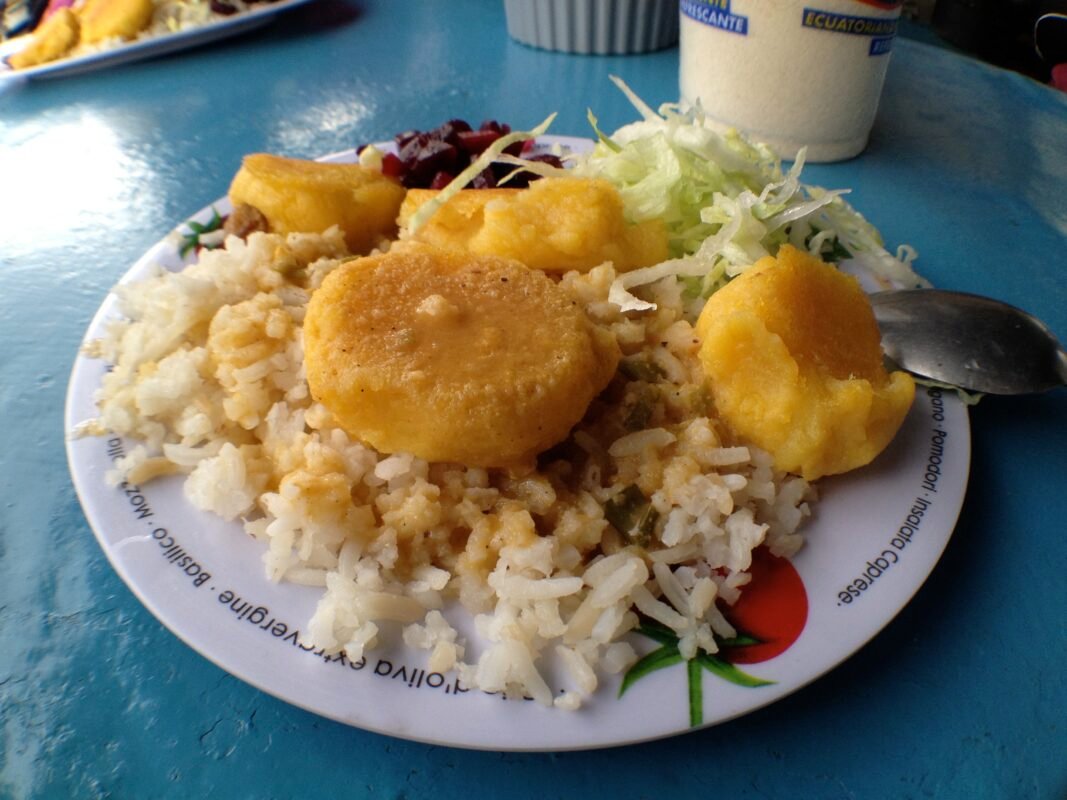 Llapingachos are delicious Ecuadorian potato patties typically filled with cheese and served with peanut sauce, tomato and onion curtido, and avocado slices.