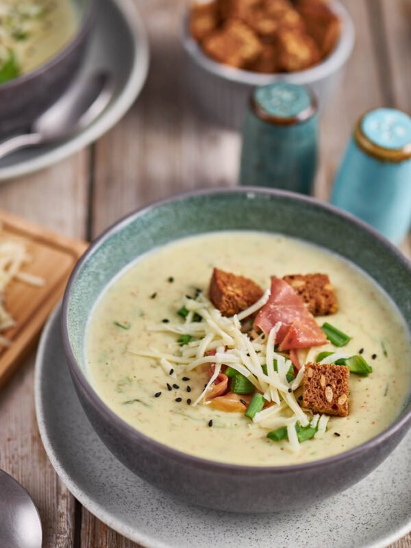 A thick and creamy soup, loaded with bacon and chives.