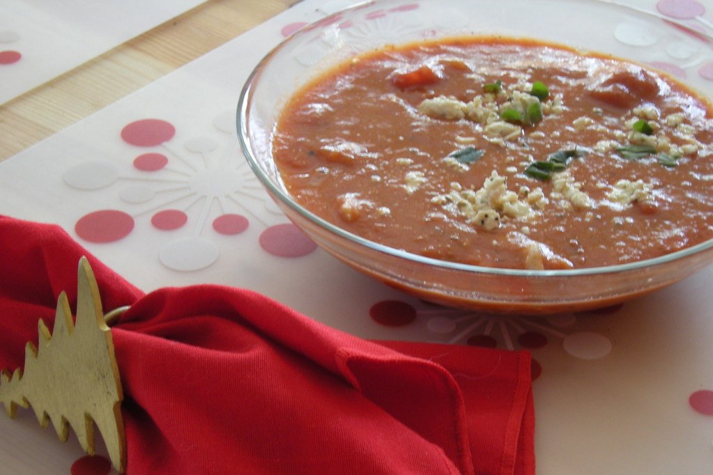Tomato soup with crab and feta is a delicious and flavorful soup made with a base of tomato broth, tender crab meat, and tangy feta cheese. The combination of sweet tomato flavors, delicate crab meat, and creamy feta cheese creates a unique and rich soup that is sure to tantalize your taste buds.