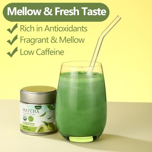 - 【Mellow & Delicious】 – Matcha powder has a mellow and delicious taste, low caffeine, and low bitterness. Adding matcha powder to ice water, milk, milkshakes, or making latte will result in a better flavor.