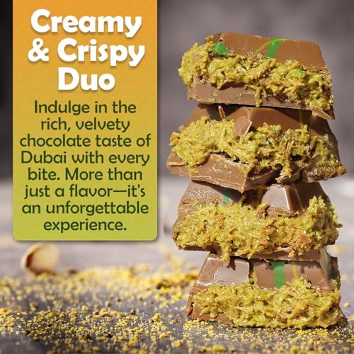 - DUBAI CRISPY CHOCOLATE PISTACHIO KUNAFA BAR: Our luxurious chocolate coating perfectly complements the kunafa filling, creating an irresistible treat for chocolate lovers.