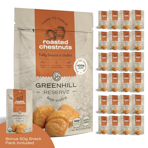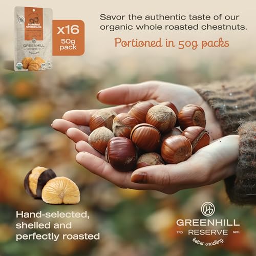 - Savor the authentic taste of GreenHill Reserve’s organic whole roasted chestnuts. Hand-selected and perfectly roasted, these chestnuts peeled and ready to eat capture the essence of premium quality. Perfectly portioned in a 50g pack, these roasted chestnuts ready to eat are your go-to healthy snack!