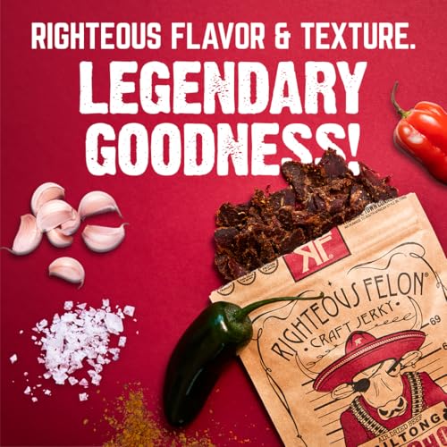 - RIGHTEOUS FELON BILTONG: We have crafted a biltong flavor so good you wonโt stop eating it until the bag is gone. A satisfying air dried meat snack packed with 16 GRAMS OF PROTEIN PER SERVING AND ZERO SUGAR! Perfect for your keto diet or anyone looking for a sugar free, low carb snack!