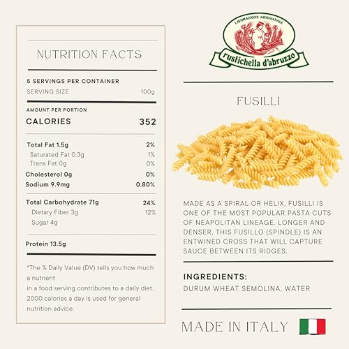 - Premium Quality Ingredients: Made with only durum wheat semolina and water, this fusilli offers a robust, hearty taste while maintaining a firm texture during cooking.