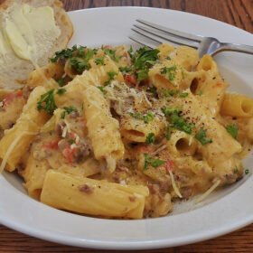 Calories: 903kcal (45%)Carbohydrates: 81g (27%)Protein: 43g (86%)Fat: 45g (69%)Saturated Fat: 21g (131%)Polyunsaturated Fat: 4gMonounsaturated Fat: 17gCholesterol: 124mg (41%)Sodium: 1805mg (78%)Potassium: 1051mg (30%)Fiber: 6g (25%)Sugar: 11g (12%)Vitamin A: 1510IU (30%)Vitamin C: 17mg (21%)Calcium: 536mg (54%)Iron: 4mg (22%)