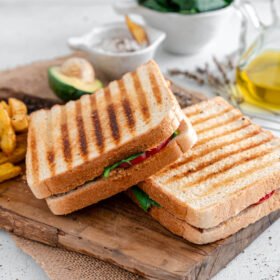 Creamy avocado, melted mozzarella, fresh spinach and sliced garden tomatoes perfectly complement the grilled chicken breast in this delicious panini.