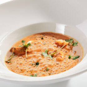 Crab bisque is a delicious and creamy soup made primarily from crab meat. It's a popular dish in many coastal regions and is loved for its rich and flavorsome taste. The bisque is typically made by combining crab meat with a flavorful broth, cream, and various seasonings. It can be enjoyed as a starter or as a main course, and is often garnished with a sprinkle of fresh herbs or a drizzle of cream.