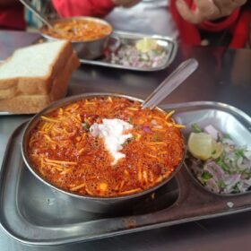 Kolhapuri Misal is a spicy, flavorful Maharashtrian dish made with sprouted moth beans (matki) in a spicy curry base, typically seasoned with a special Kolhapuri masala. It is served with crunchy farsan (fried snacks), topped with a dollop of yogurt for a cooling contrast, and garnished with chopped onions for added crunch and freshness. It's a dish that offers a mix of textures and flavors, perfect for those who enjoy bold and spicy dishes.