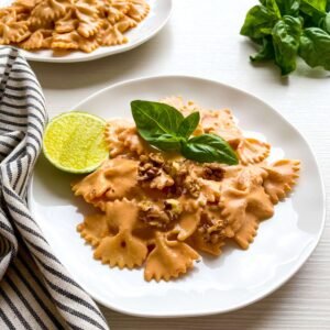 A hearty pasta such as bow tie or penne will stand up well to the thick and delicious roasted red pepper sauce created in this recipe. The sauce comes together in just minutes using a high-speed blender making it perfect for busy weeknights.